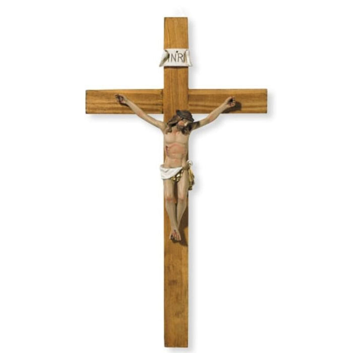 This crucifix was designed using a wood cross base and full color resin corpus. It is perfectly sized for placing in the home, parish or classroom. It also makes a great gift for any occasion.